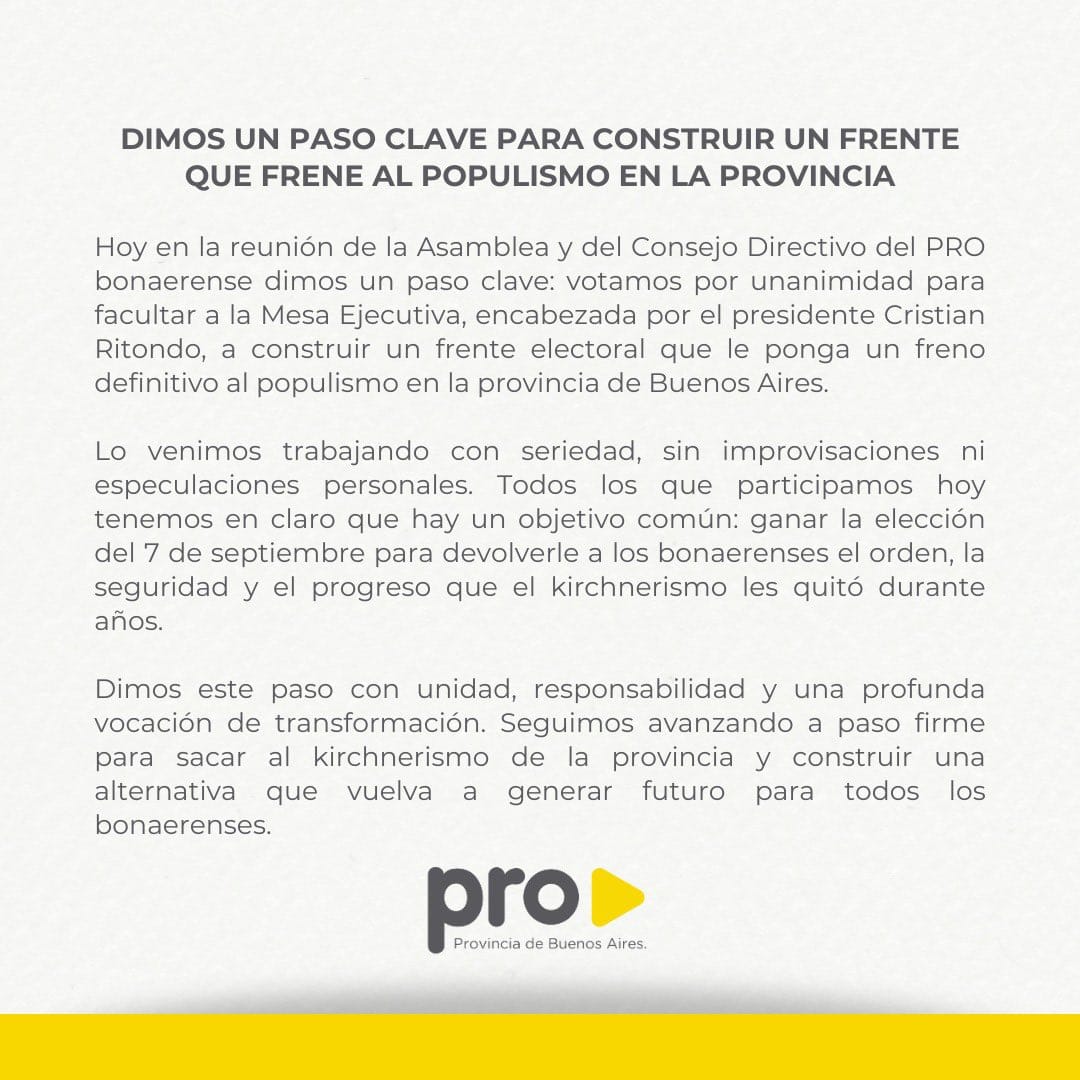 La decisión fue tomada en una asamblea provincial encabezada por Cristian Ritondo, presidente del PRO bonaerense, y Néstor Grindetti, titular de la Asamblea. Participaron figuras clave como Diego Santilli, Soledad Martínez, María Sotolano, Julio Garro y Pablo Petrecca, entre otros.