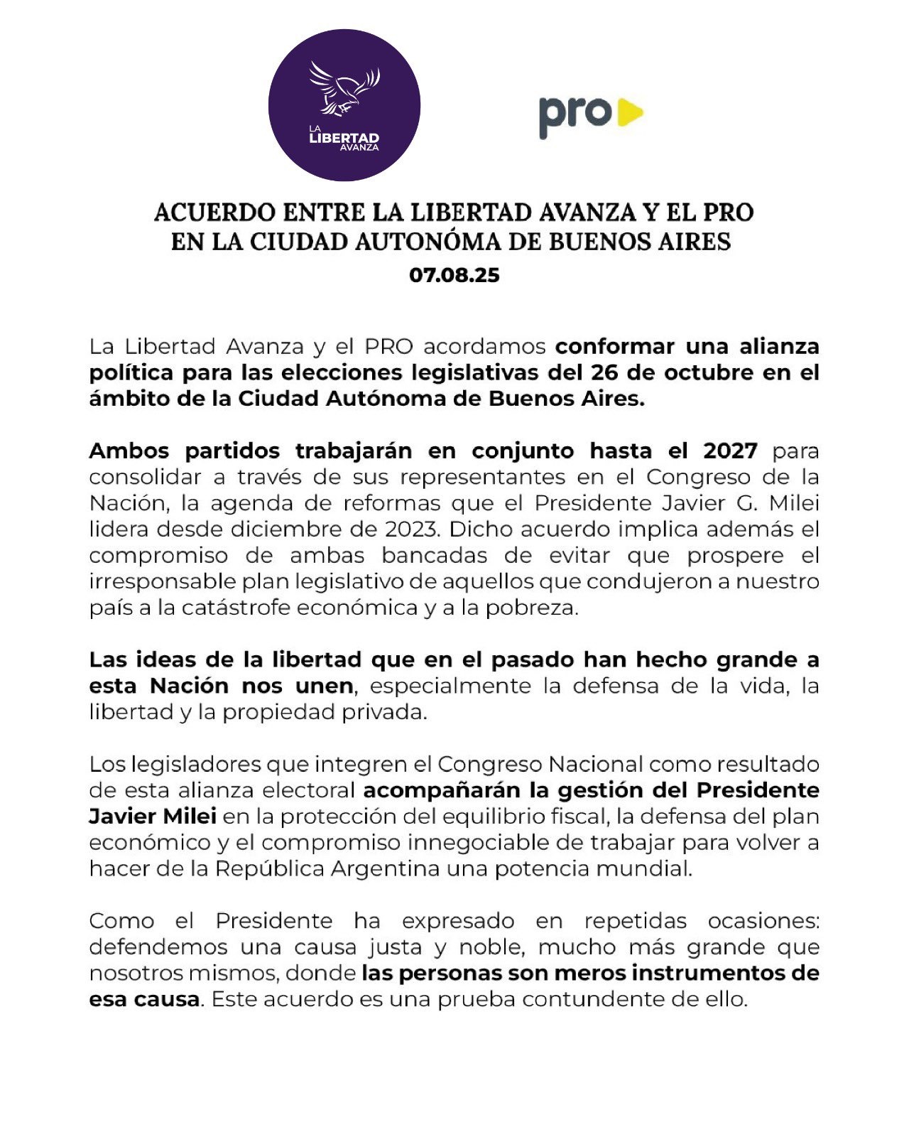 En un comunicado conjunto publicado este mediodía, el PRO y La Libertad Avanza oficializaron su alianza electoral en la Ciudad de Buenos Aires, con un tono marcadamente libertario y una narrativa que busca enmarcar el acuerdo como parte de una “causa justa y noble”. El texto, cuidadosamente redactado por los equipos técnicos de ambos partidos, confirma que trabajarán juntos hasta 2027 y que el objetivo principal es consolidar en el Congreso la agenda de reformas impulsada por el presidente Javier Milei.