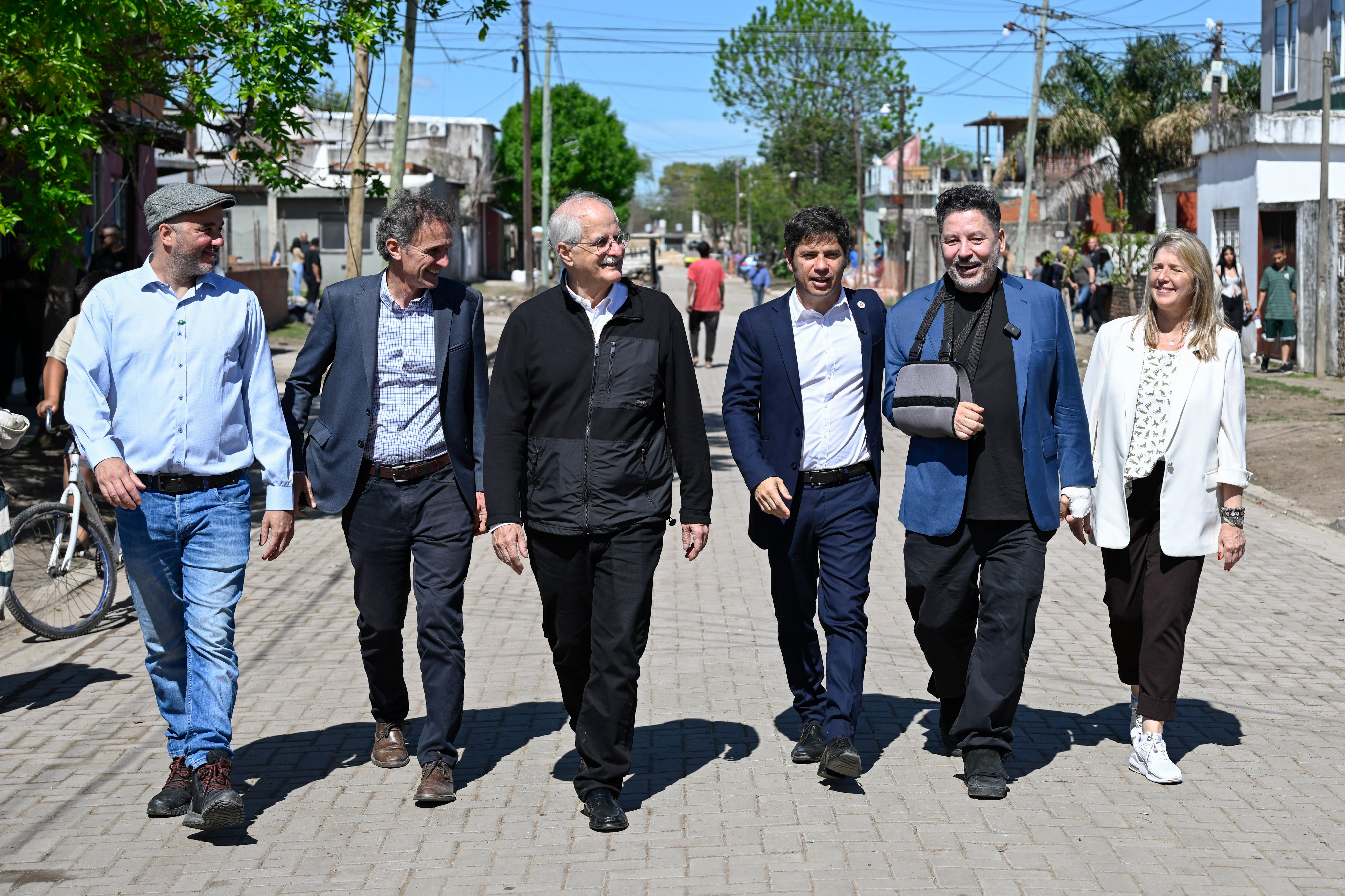 El gobernador de la provincia de Buenos Aires, Axel Kicillof, encabezó este martes el acto de entrega de escrituras gratuitas en beneficio de familias del municipio de Merlo, donde además recorrió los avances de las obras de pavimentación en el barrio La Blanquita. Fue junto al intendente local, Gustavo Menéndez; y el dirigente Jorge Taiana.