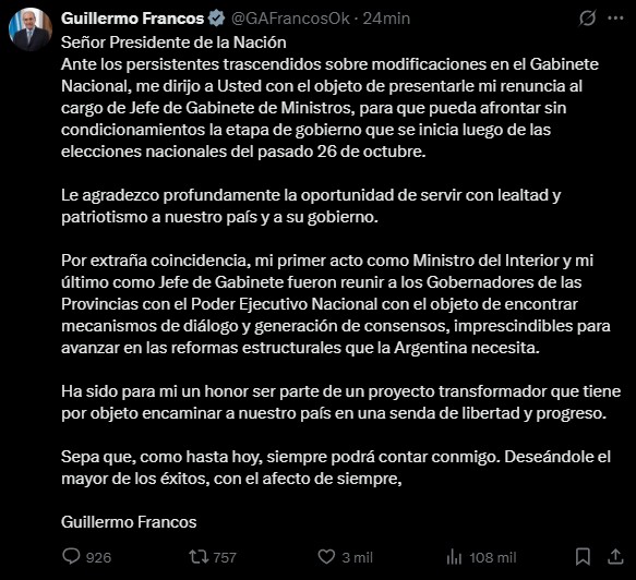 La salida de Francos se produce luego de semanas de intensos rumores sobre cambios en el Gabinete nacional, que el propio funcionario había desmentido públicamente días atrás. En su carta de renuncia, difundida a través de redes sociales, Francos expresó: “Ha sido para mí un honor ser parte de un proyecto transformador que tiene por objeto encaminar a nuestro país en una senda de libertad y progreso”.