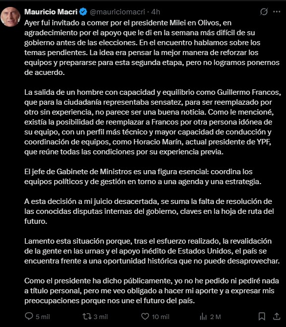 La publicación de Macri no solo expone diferencias tácticas con Milei, sino que también marca un punto de inflexión en la relación entre ambos. Tras meses de apoyo explícito, el expresidente parece tomar distancia del rumbo que está adoptando el Gobierno, especialmente en lo que refiere a la conformación del equipo de gestión.