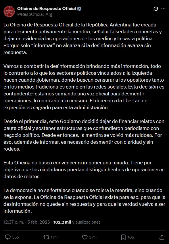 La nueva cuenta de X difundió un extenso texto donde realizó varias aclaraciones con respecto a su misión y funcionamiento. En el mismo, dejaron por sentado que "esta Oficina no busca convencer ni imponer una mirada. Tiene por objetivo que los ciudadanos puedan distinguir hechos de operaciones y datos de relatos", explicaron.