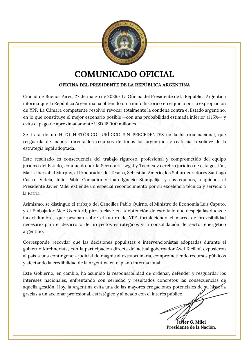 La respuesta del Gobierno nacional no tardó en llegar. Desde la Casa Rosada, la Oficina de Respuesta Oficial difundió un comunicado en tono áspero: calificó a Kicillof de “fracasado ex ministro” y lo responsabilizó por haber expuesto al país a un litigio que se prolongó más de una década. El mensaje buscó instalar la idea de que el kirchnerismo dejó una herencia de riesgos financieros que recién ahora se logra desactivar.