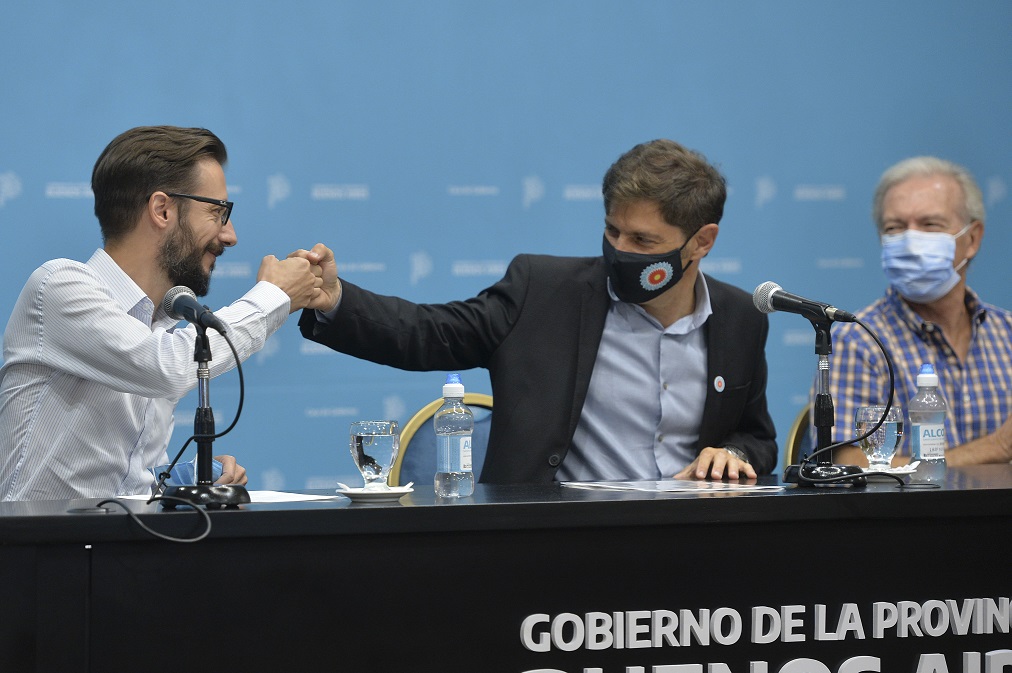 El gobernador de la provincia de Buenos Aires, Axel Kicillof, encabezó esta mañana junto al ministro de Infraestructura y Servicios Públicos, Agustín Simone, el acto de puesta en marcha de 36 convenios que permitirán destinar 5.100 millones de pesos para la reactivación de obras de vivienda que habían sido paralizadas y la construcción de 1.200 soluciones habitacionales en 35 municipios bonaerenses. También estuvo presente durante el anuncio el subsecretario de Obras Públicas, Ernesto Selzer.