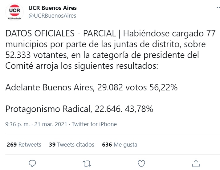 El resultado parcial indica que, con los datos de 77 municipios ya cargados, sobre 52.333 votantes, la lista "Adelante Buenos Aires" de Abad cosecha el 56,22% (29.082 votos) mientras que "Protagonismo Radical", la lista de Posse, obtiene el 43,78% (22.646 votos).