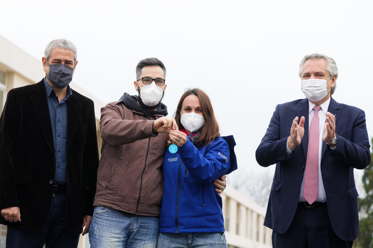 “Para mi es una enorme alegría estar entregando la casa número 10 mil y es una enorme alegría saber que de aquí a fin de año vamos a estar construyendo más de 100 mil casas más como éstas”, enfatizó el mandatario junto al ministro de Desarrollo Territorial y Hábitat, Jorge Ferraresi.