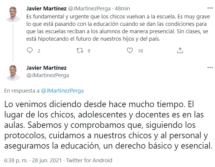 Por último, indicó que "lo venimos diciendo desde hace mucho tiempo. El lugar de los chicos, adolescentes y docentes es en las aulas. Sabemos y comprobamos que, siguiendo los protocolos, cuidamos a nuestros chicos y al personal y aseguramos la educación, un derecho básico y esencial", finalizó.