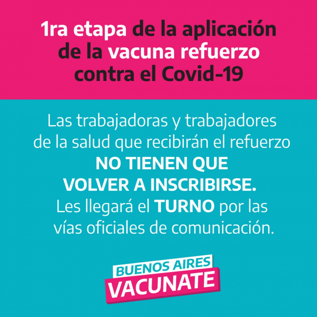 La cartera de salud bonaerense anunció que el mes próximo comenzarán a aplicarse dosis de refuerzo. El primer grupo que recibirá los turnos para estas dosis será el personal sanitario que se desempeña en la Provincia, un universo conformado por 514 mil personas.