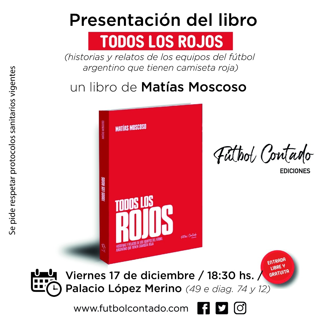 Por su parte, Fútbol Contado Ediciones es una editorial con base en La Plata nacida en 2020, que ya publicó cuatro títulos entre su año del debut y 2021. Todos los Rojos será el quinto lanzamiento y la primera presentación de manera presencial, en la que se podrá comprar el libro y el autor también firmará ejemplares. Además se transmitirá en vivo por las distintas redes sociales. Para más detalles, visitar las webs www.futbolcontado.com y todoslosrojos.com.ar.