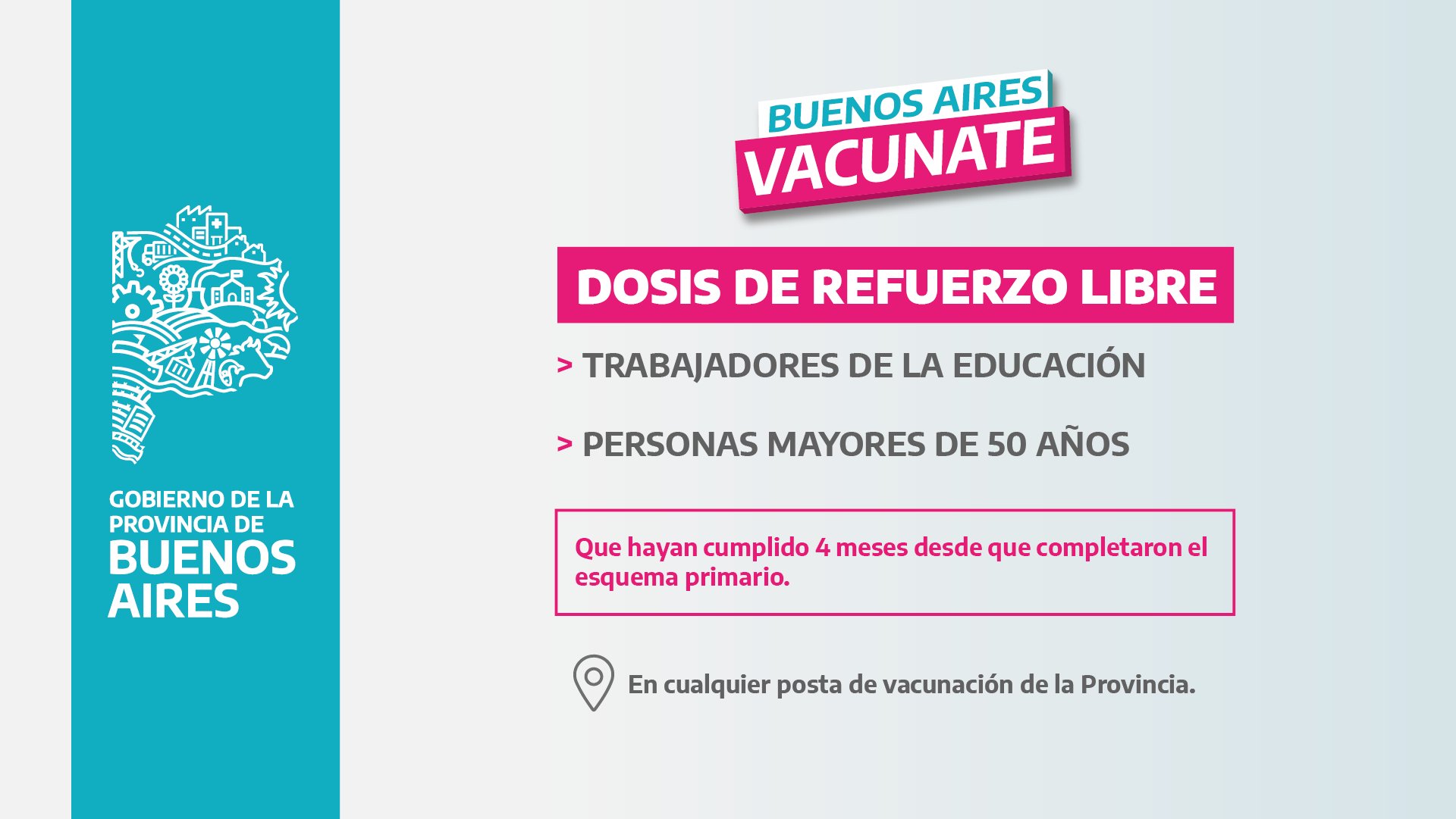 El gobernador de la provincia de Buenos Aires, Axel Kicillof, anunció hoy que desde este miércoles habrá tercera dosis libre de la vacuna contra el coronavirus para docentes bonaerenses y mayores de 50 años. Asimismo precisó que se llevará a cabo una campaña de inmunización en 2.600 escuelas para aumentar la vacunación de los alumnos de cara al inicio del ciclo lectivo.