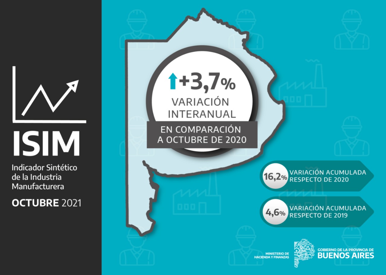El Ministerio de Hacienda y Finanzas informa que la industria manufacturera de la provincia de Buenos Aires tuvo un crecimiento en octubre del 3,7% respecto del mismo mes del 2020. Mientras tanto, en el acumulado de los primeros diez meses de 2021 se registró una suba de 16,2% respecto al mismo período del 2020.
