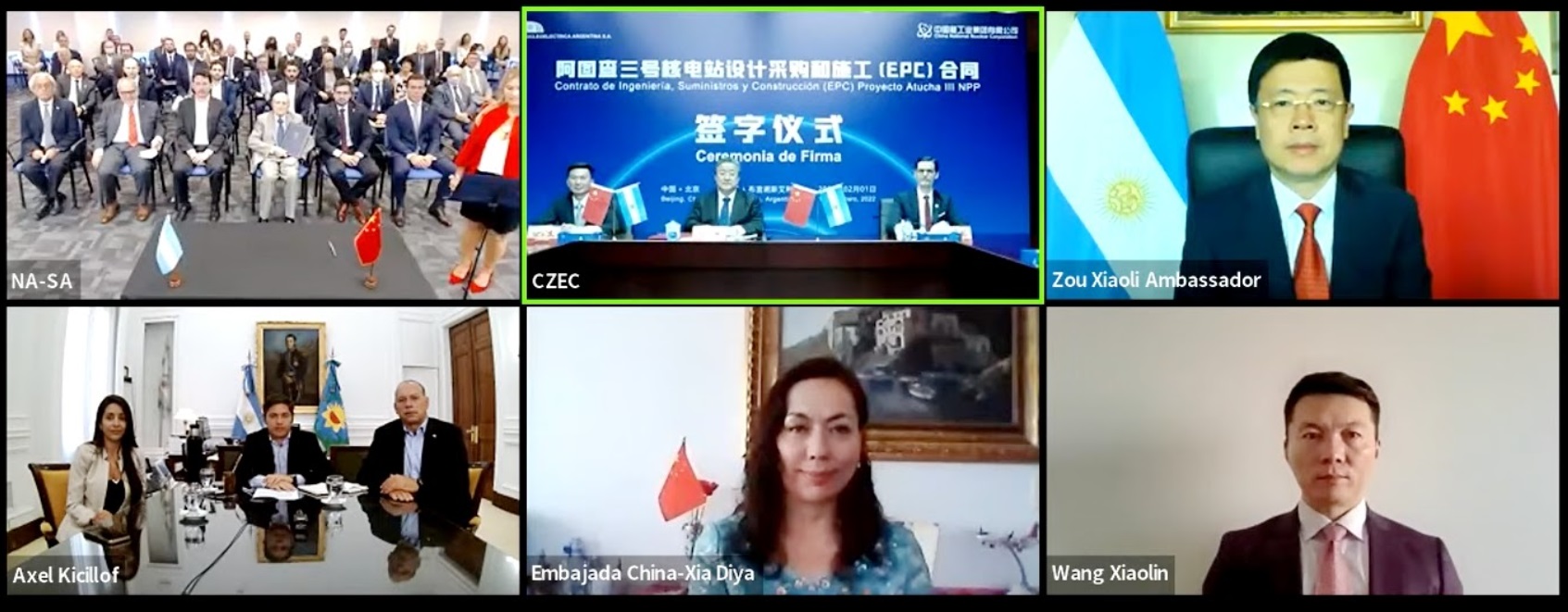 Participaron los presidentes de la CNNC, Yu Jianfeng; y de la NA-SA, José Luis Antúnez; los embajadores de la Argentina en China, Sabino Vaca Narvaja; y de China en la Argentina, Zou Xiaoli; el director adjunto de la Autoridad de Energía Atómica de China, Huang Ping; el ministro bonaerense de Seguridad, Sergio Berni; la diputada nacional Agustina Propato; y el subsecretario de Energía Eléctrica, Federico Basualdo.