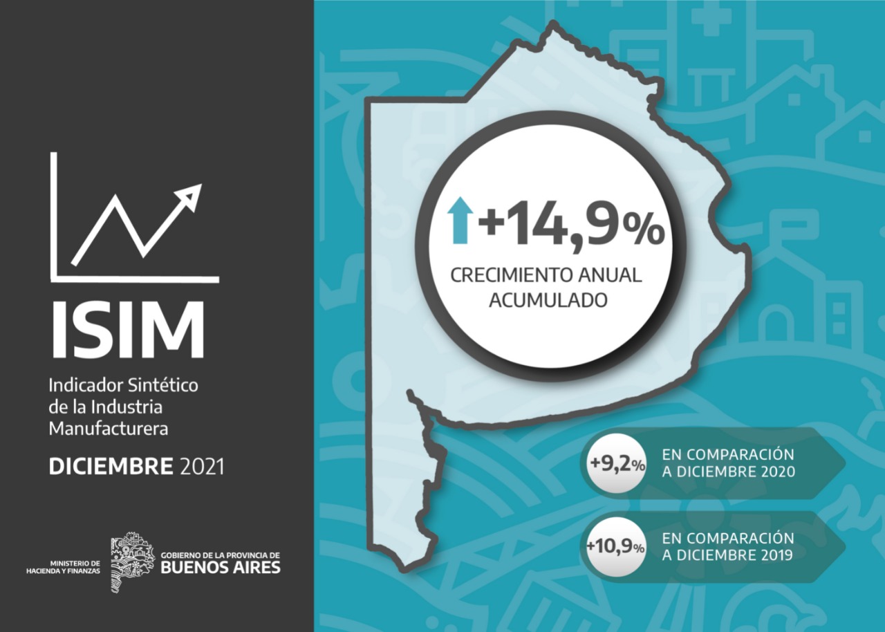 El Ministerio de Hacienda y Finanzas informa que la industria manufacturera de la provincia de Buenos Aires tuvo un crecimiento acumulado en 2021 del 14,9% respecto al mismo período del 2020; mientras que registró una suba en diciembre del 9,2% respecto al mismo mes del año anterior.