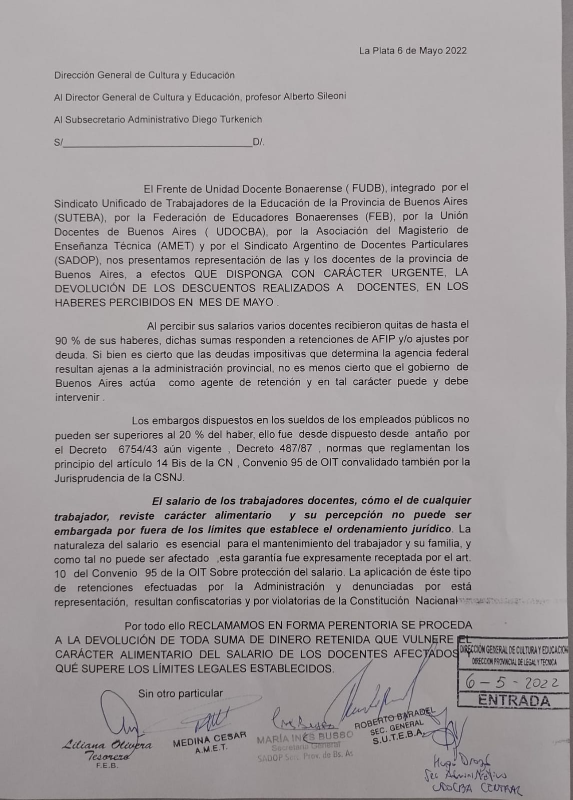 “El salario de los trabajadores docentes reviste carácter alimentario y su percepción no puede ser embargada por fuera de los límites que establece el ordenamiento jurídico. La naturaleza del salario es esencial para el mantenimiento del Trabajador y su familia, como tal no puede ser afectado; esta garantía fue expresamente receptada por el Art. 10 del Convenio 95 de la OIT sobre protección del salario”, indicaron en un escueto comunicado.