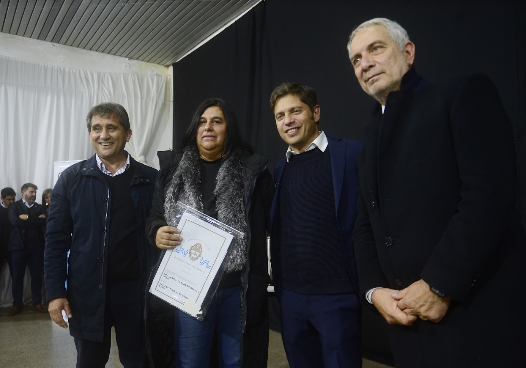 En el marco del programa Mi Escritura, Mi Casa, el gobernador de la provincia de Buenos Aires, Axel Kicillof, encabezó este martes el acto de entrega de 127 títulos de propiedad gratuitos para familias del municipio de Lobería. Fue en la sede del Club de Pesca, junto al ministro de Justicia y Derechos Humanos, Julio Alak, y el intendente local, Juan José Fioramonti. A continuación, acompañado por el director general de Cultura y Educación, Alberto Sileoni, recorrió los avances de las obras del Jardín Maternal N° 1 y el Centro Cultural y Escuela de Estética, y también visitó el taller del ex piloto de automovilismo, Oscar “Pincho” Castellano.