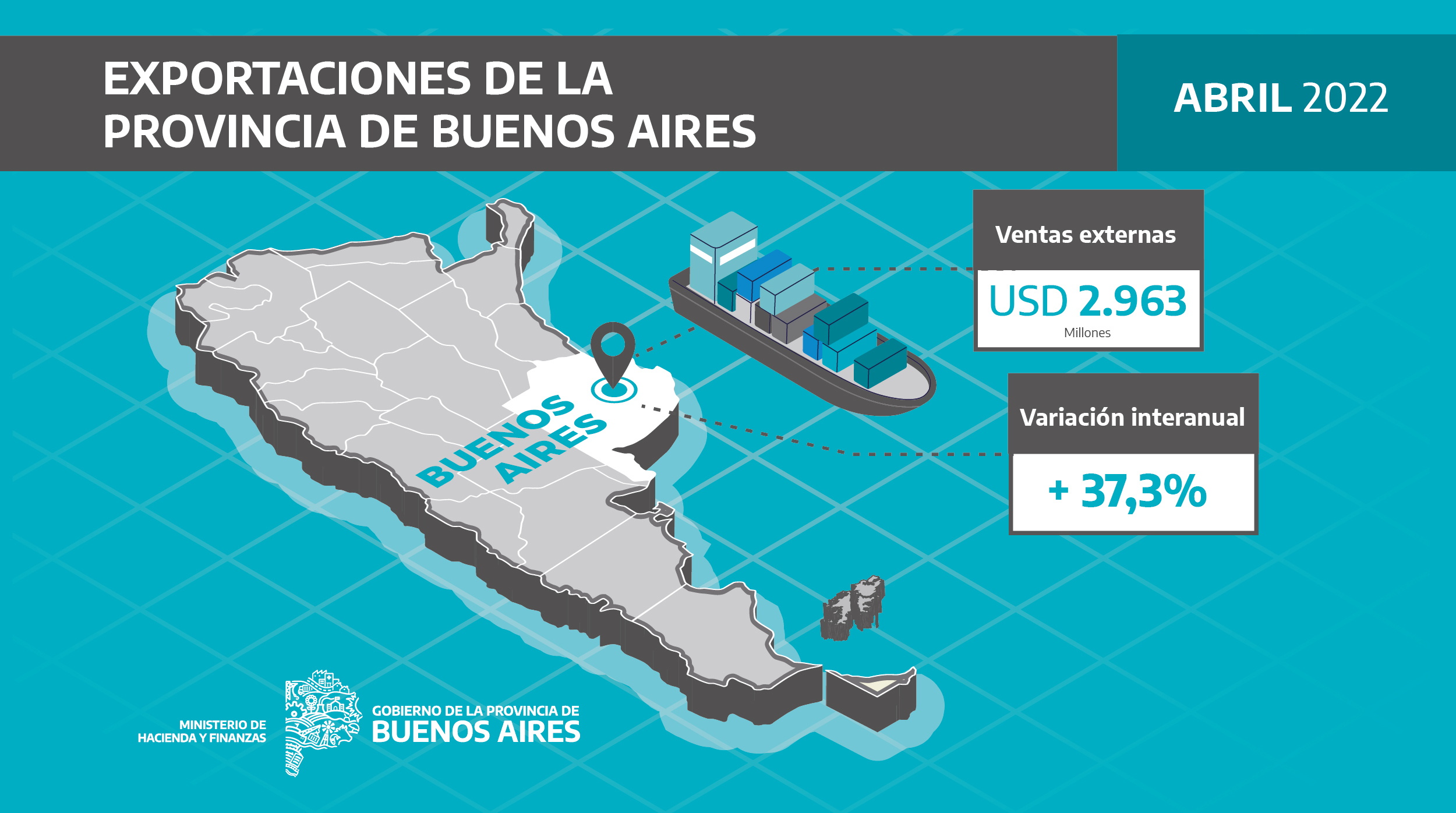 El Ministerio de Hacienda y Finanzas de la provincia de Buenos Aires informa que las exportaciones de la provincia de Buenos Aires alcanzaron los USD 2.963 millones durante abril de 2022, el mejor abril y el mejor mes de la serie, desde 2010. Además, tuvieron un crecimiento interanual del 37,3% con respecto al mismo mes de 2021 y del 57,6% respecto de 2019. Adicionalmente, durante el cuarto mes del año, la Provincia aportó el 35,6% del valor de las ventas externas del país. La mayor contribución se dio en Combustibles y Energía (47,9%), seguido por el rubro de Manufacturas de Origen Industrial (40,2%).