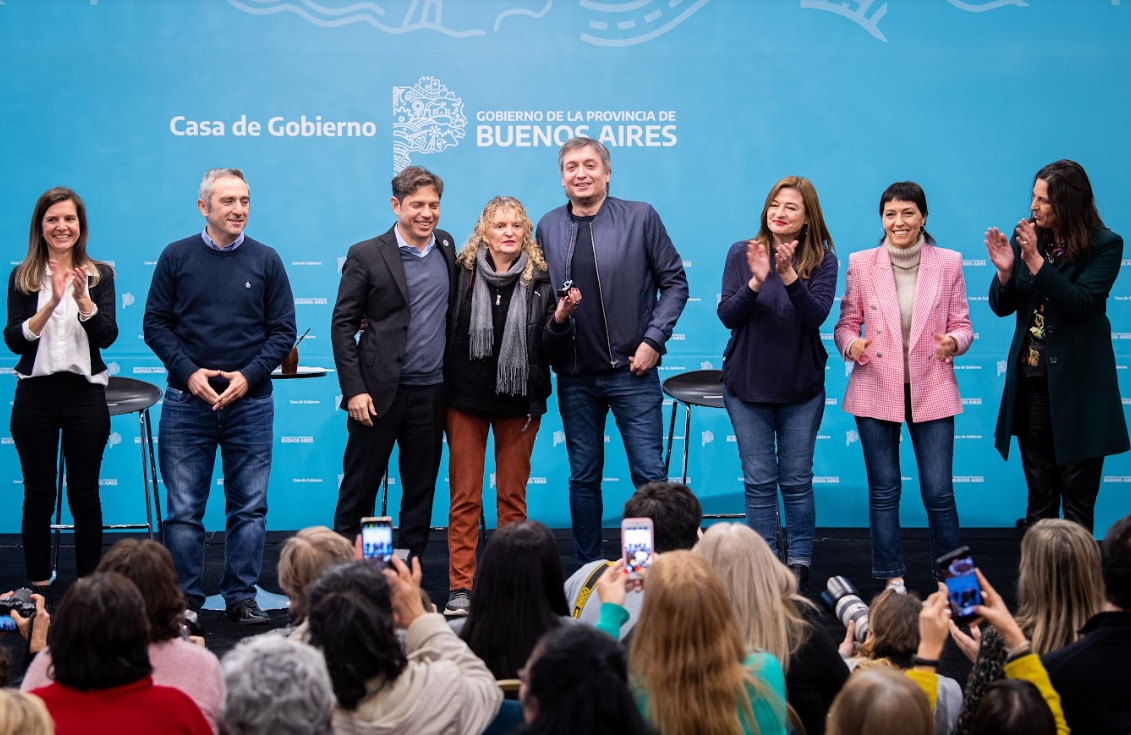 El gobernador de la provincia de Buenos Aires, Axel Kicillof, el diputado nacional Máximo Kirchner y la directora ejecutiva de la ANSES, Fernanda Raverta, encabezaron esta tarde el acto por el primer aniversario de la puesta en marcha del Programa de Reconocimiento de Aportes por Tareas de Cuidado.