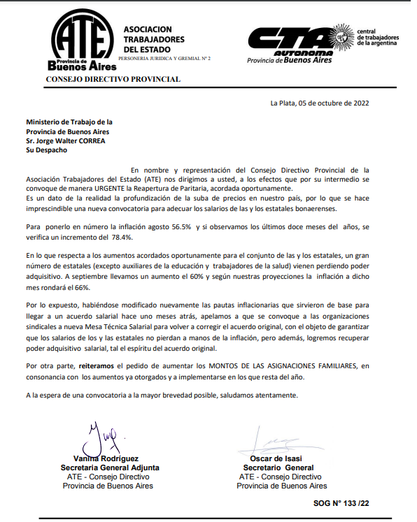 “En lo que respecta a los aumentos acordados oportunamente para el conjunto de las y los estatales, un gran número de estatales (excepto auxiliares de la educación y trabajadores de la salud) vienen perdiendo poder adquisitivo. A septiembre llevamos un aumento el 60% y según nuestras proyecciones la inflación a dicho mes rondará el 66%”, señala la carta presentada por el Consejo Directivo Provincial a la cartera de trabajo.