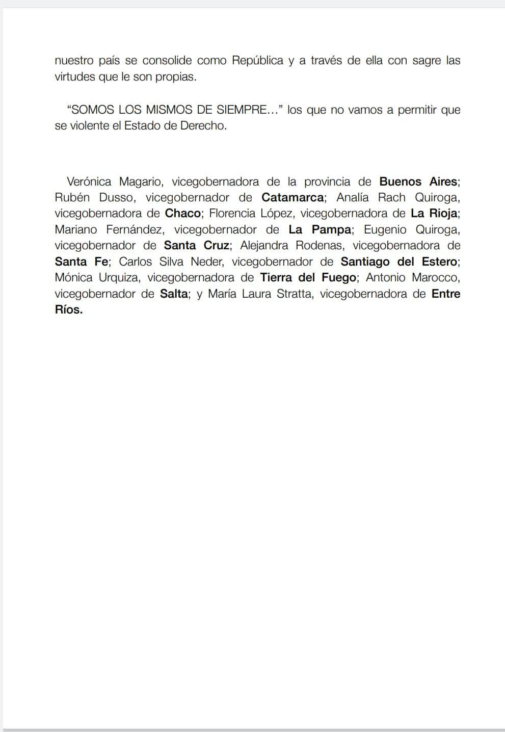 Verónica Magario, vicegobernadora de la provincia de Buenos Aires; Rubén Dusso, vicegobernador de Catamarca; Analía Rach Quiroga, vicegobernadora de Chaco; Florencia López, vicegobernadora de La Rioja; Mariano Fernández, vicegobernador de La Pampa; Eugenio Quiroga, vicegobernador de Santa Cruz; Alejandra Rodenas, vicegobernadora de Santa Fe; Carlos Silva Neder, vicegobernador de Santiago del Estero; Mónica Urquiza, vicegobernadora de Tierra del Fuego; Antonio Marocco, vicegobernador de Salta; y María Laura Stratta, vicegobernadora de Entre Ríos.