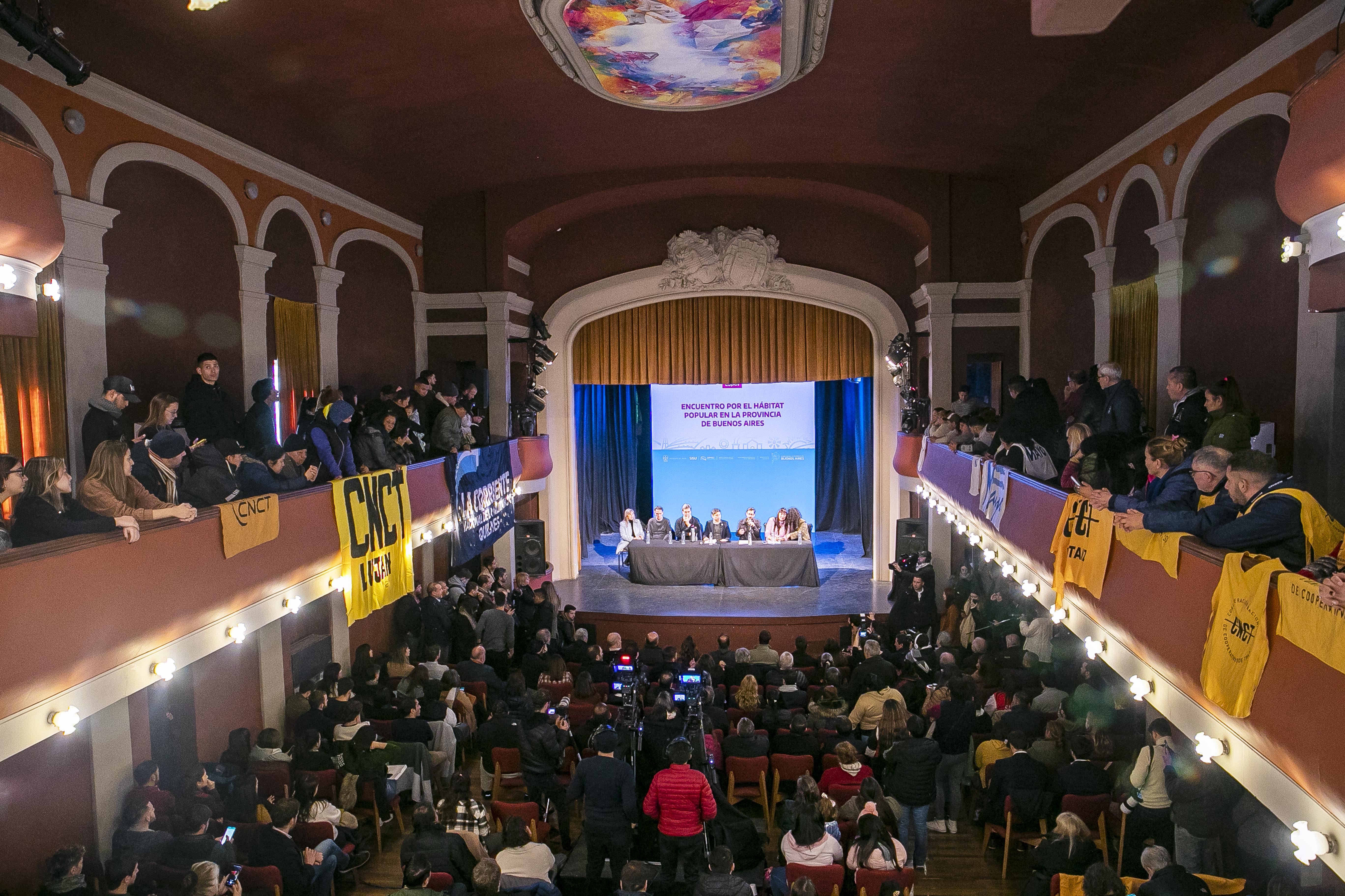 El gobernador Axel Kicillof encabezó este martes el acto de cierre del Encuentro por el Hábitat Popular en la Provincia de Buenos Aires, en el teatro Trinidad Guevara del municipio de Luján. Participaron los ministros de Obras Públicas de la Nación, Gabriel Katopodis; y de Hábitat y Desarrollo Urbano bonaerense, Agustín Simone; la ministra de Gobierno, Cristina Álvarez Rodríguez; la secretaria de Integración Socio Urbana del Ministerio de Desarrollo Social de la Nación, Fernanda Miño; la directora ejecutiva del Organismo Provincial de Integración Social y Urbana (OPISU), Romina Barrios; y el intendente local, Leonardo Boto.