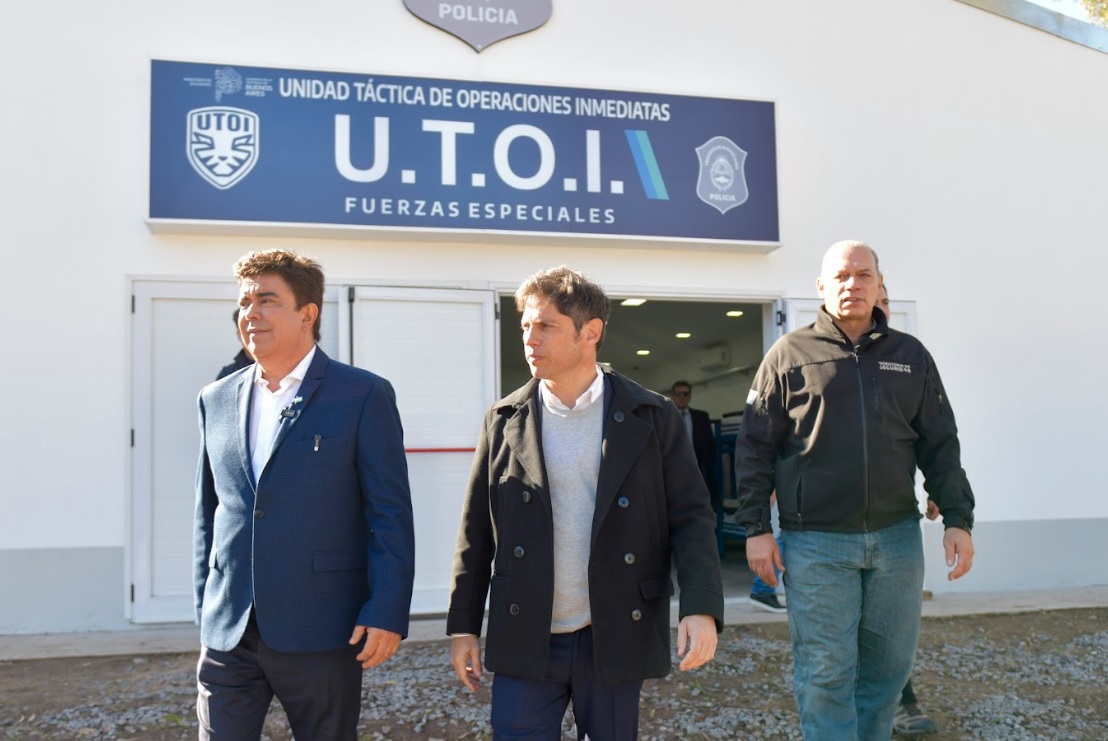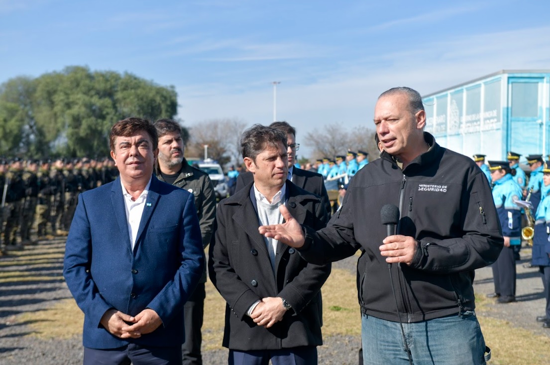 El gobernador de la provincia de Buenos Aires, Axel Kicillof, encabezó este viernes el acto de puesta en funcionamiento de 90 patrulleros y la incorporación de nuevos efectivos que se sumarán a las tareas de prevención del delito en el municipio de La Matanza. Fue en el Centro de Coordinación Estratégica de Puente 12 junto al ministro de Seguridad, Sergio Berni, y el intendente local, Fernando Espinoza, con quienes recorrió además las nuevas instalaciones del edificio de la Unidad Táctica de Operaciones Inmediatas (UTOI) y la sala de monitoreo de la Fuerza Barrial de Aproximación.