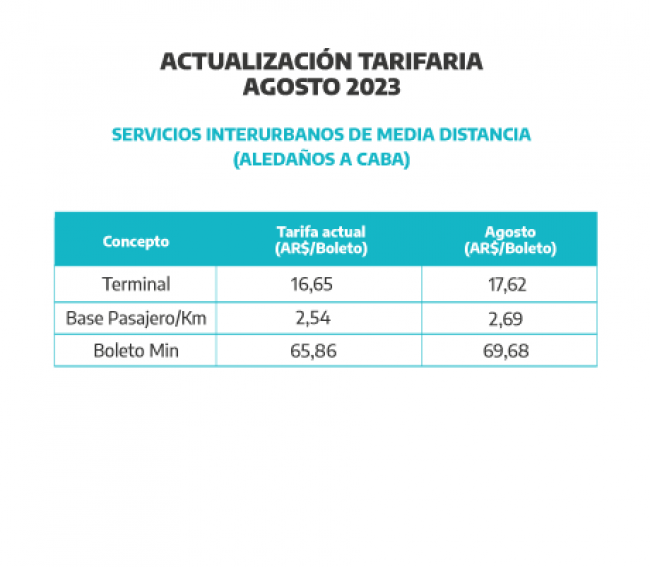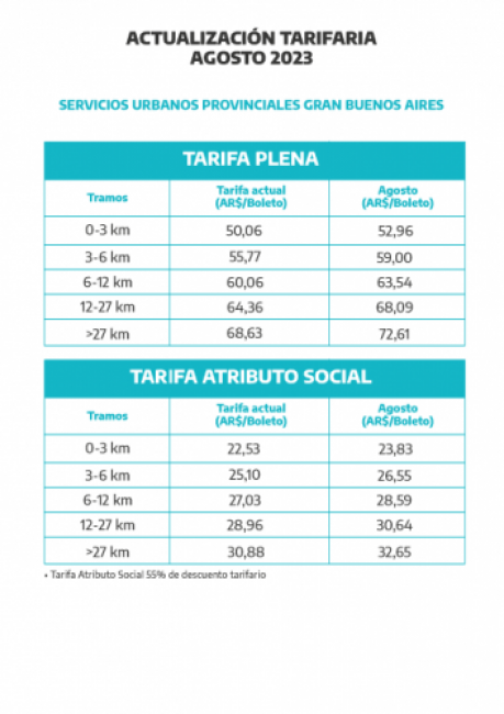 El Ministerio de Transporte de la Provincia de Buenos Aires, en el marco de la actualización tarifaria aplicable a los servicios públicos de transporte de pasajeros por automotor de jurisdicción provincial, de carácter urbano e interurbano de media distancia (aledaños a la Ciudad Autónoma de Buenos Aires), de conformidad con lo previsto en el artículo 4° de la Resolución N° 55/23, pone en conocimiento público los cuadros tarifarios actualizados de acuerdo al Índice de Precios al Consumidor (IPC) Nivel General de la Región Gran Buenos Aires, relevado por el Instituto Nacional de Estadísticas y Censo (INDEC), correspondiente al mes de junio del año 2023, que entrarán en vigencia a partir del 1° de agosto del corriente año.