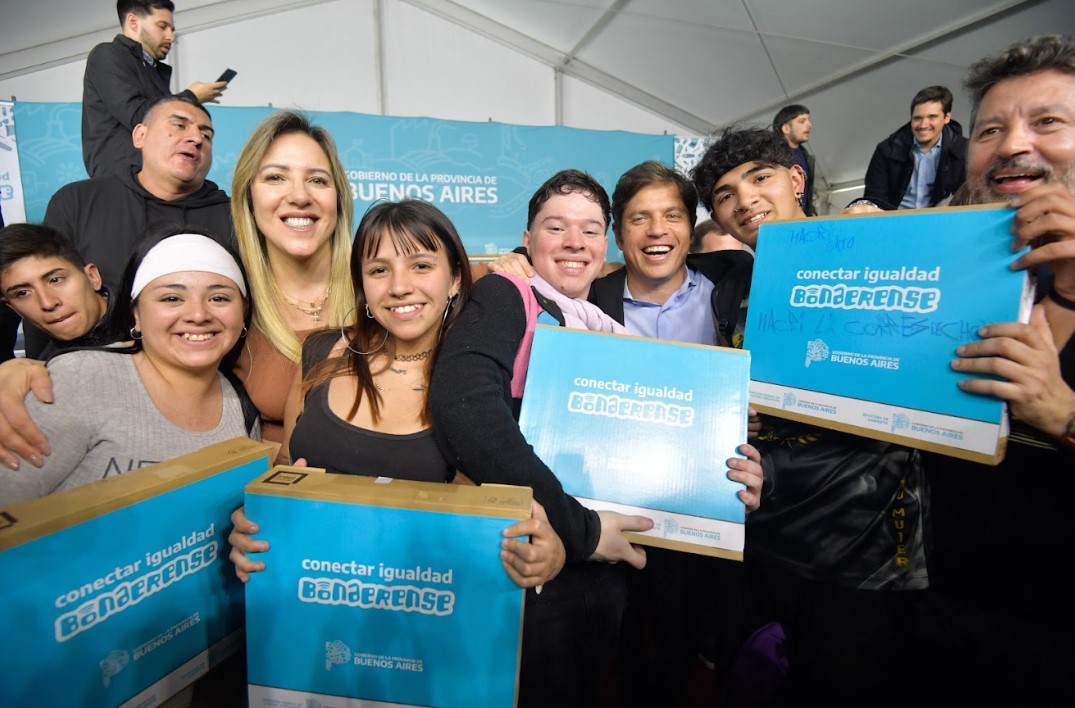 A continuación, Kicillof visitó la Feria del Libro de Merlo y encabezó allí el acto de entrega de 425 computadoras a estudiantes de siete establecimientos secundarios del municipio.