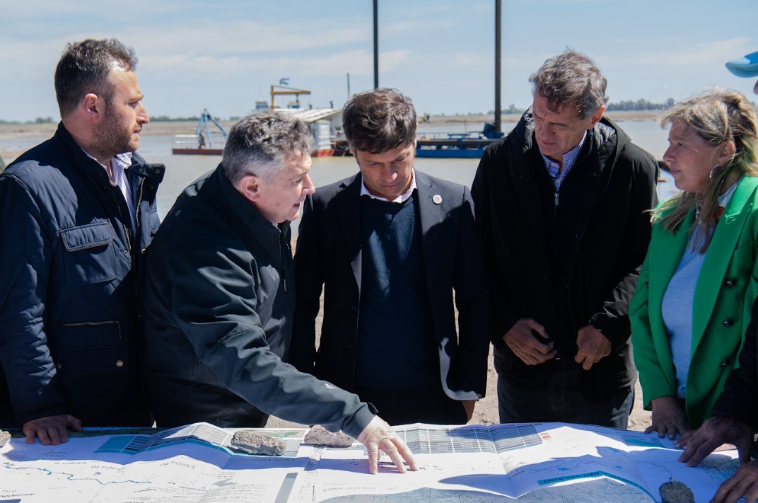 El gobernador de la provincia de Buenos Aires, Axel Kicillof, recorrió este miércoles los avances de las obras de adecuación del cauce del Río Salado y mantuvo una reunión con productores rurales de la región en Veinticinco de Mayo.
