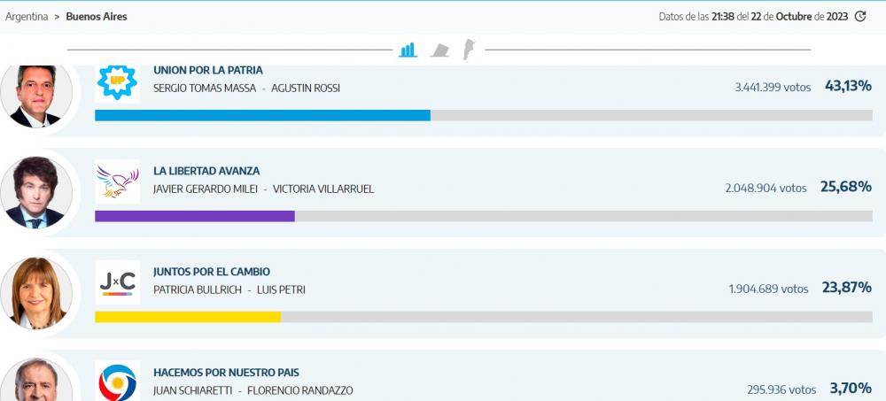 El gobernador bonaerense Axel Kicillof (Unión por la Patria) se impuso esta noche en la provincia de Buenos Aires con el 45,36% de los votos y lograba de esta manera la reelección, seguido por Néstor Grindetti (Juntos por el Cambio) que sumaba un 26,04%; Carolina Píparo (La Libertad Avanza), que llega al 24,64% y Rubén "Pollo" Sobrero (Frente de Izquierda) que cosecha un 3,94%.