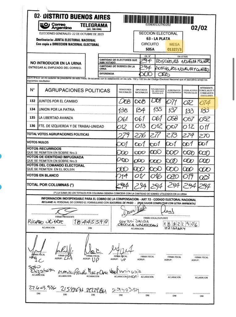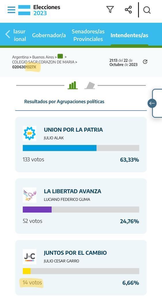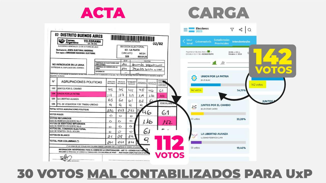 Lo mismo ocurre en la mesa 1327/3 del circuito 505A, donde el acta del presidente de mesa le asigna 74 votos a Garro, mientras que el número publicado en la web es 14 (lo que da un diferencial de 60 votos); en la mesa 445/9 del circuito 496B, donde la autoridad de mesa anotó 93 votos para Julio Garro pero figuran 43 en el escrutinio provisorio oficial (lo que da un diferencial de 50 votos); entre otras.