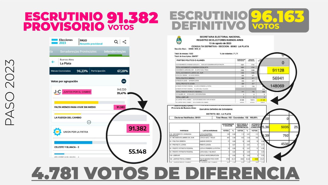 Vale mencionar que, si bien las diferencias entre los resultados que arrojan ambos escrutinios han sido mínimas a lo largo de la historia electoral y no suelen modificar los resultados finales, en elecciones muy parejas, como que la que tiene lugar en La Plata, sí resulta determinante.