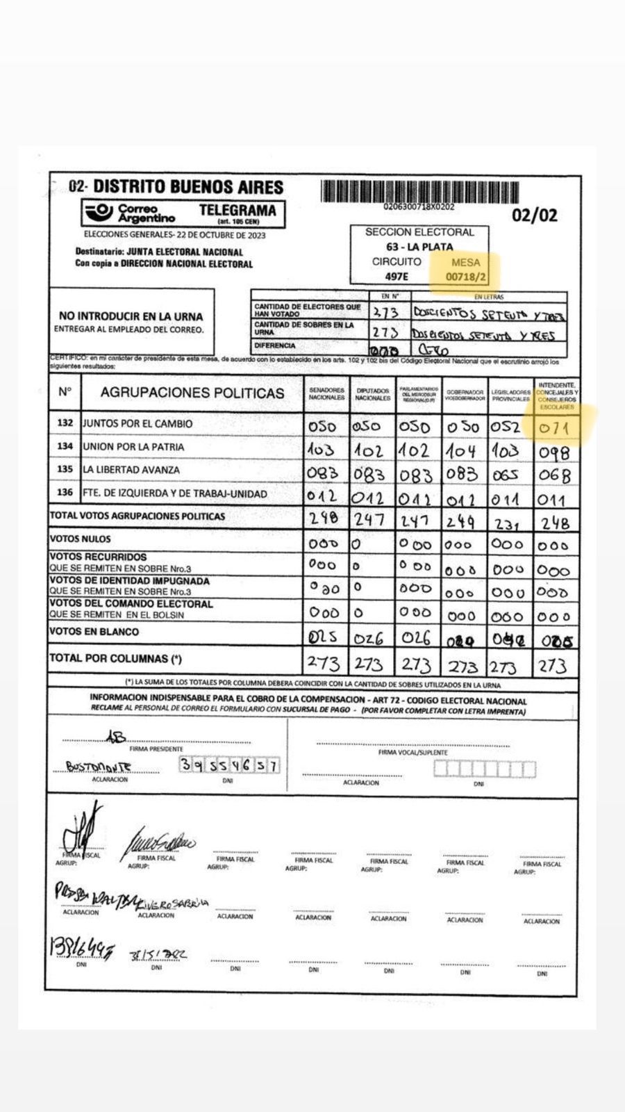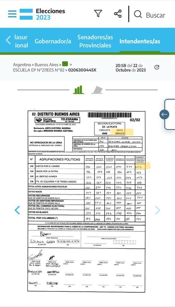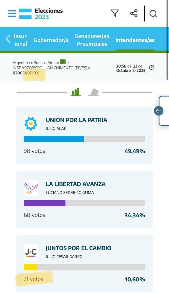 Solo por citar un ejemplo que todos los ciudadanos pueden corroborar ingresando a https://resultados.gob.ar/, en la mesa 718/2 del circuito 497E se lee la cifra “71” dentro de la categoría a intendente de Juntos por el Cambio y el número “21” en la carga que figura en el escrutinio definitivo, lo que arroja una diferencia de 50 votos.