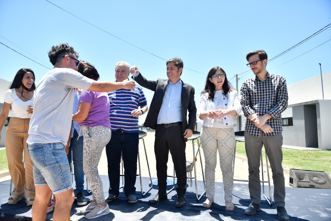 El gobernador de la provincia de Buenos Aires, Axel Kicillof, encabezó este viernes el acto de entrega de 27 viviendas para familias del barrio Valacco, en el municipio de Salto, junto a la ministra de Hábitat y Desarrollo Urbano, Silvina Batakis; el asesor del gobernador, Agustín Simone; el intendente Ricardo Alessandro; y el secretario general de Coordinación municipal, Camilo Alessandro.