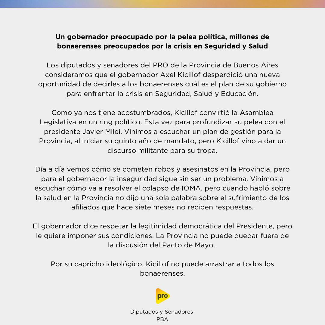 Además, los legisladores remarcaron que "como ya nos tiene acostumbrados, Kicillof convirtió la Asamblea Legislativa en un ring político para profundizar su pelea con el presidente Javier Milei. Vinimos a escuchar un plan de gestión para la Provincia y Kicillof vino a dar un discurso militante para su tropa".