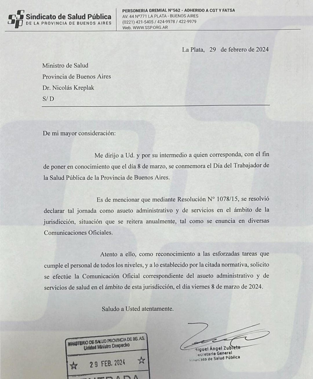 “El Día del Trabajador Público de la Salud de la Provincia de Buenos Aires, que se conmemora el día 8 de marzo.