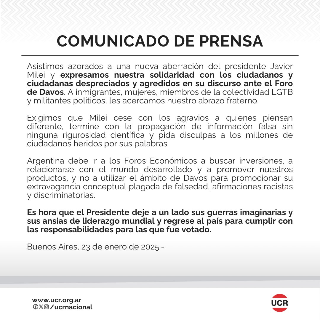 "Asistimos azorados a una nueva aberración del presidente Javier Milei y expresamos nuestra solidaridad con los ciudadanos y ciudadanas despreciados y agredidos en su discurso ante el Foro de Davos. A inmigrantes, mujeres, miembros de la colectividad LGBT y militantes políticos, les acercamos nuestro abrazo fraterno", reza el comunicado en su inicio.