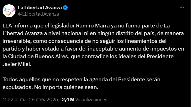 En ese sentido, el oficialismo precisó: "LLA informa que el legislador Ramiro Marra ya no forma parte de La Libertad Avanza a nivel nacional ni en ningún distrito del país, de manera irreversible, como consecuencia de no seguir los lineamientos del partido y haber votado a favor del inaceptable aumento de impuestos en la Ciudad de Buenos Aires, que contradice los ideales del presidente Javier Milei".