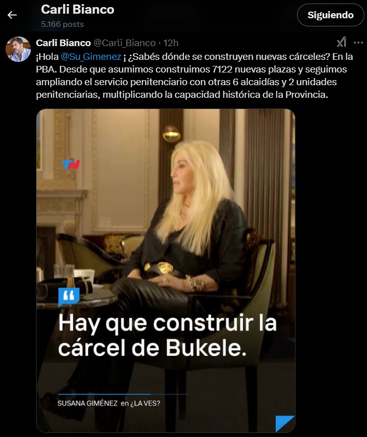 Desde el gobierno de Axel Kicillof, el ministro Carlos Bianco, le respondió a Susana Giménez, quien pidió que se construyan “cárceles como las de (Nayib)Bukele”, presidente de El Salvador: “¿Sabés dónde se construyen nuevas cárceles? En la Provincia de Buenos Aires”, expresó el funcionario en redes sociales.
