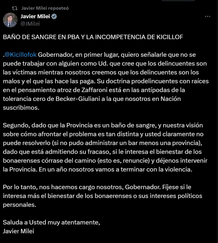 En un mensaje publicado en la red social X (ex Twitter), Milei calificó la situación en Buenos Aires como un "baño de sangre" y aseguró que Kicillof "no puede resolver el problema de la inseguridad".