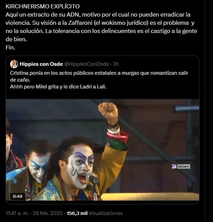 “KIRCHNERISMO EXPLÍCITO. Aquí un extracto de su ADN, motivo por el cual no pueden erradicar la violencia”, criticó el mandatario a través de su cuenta de X.