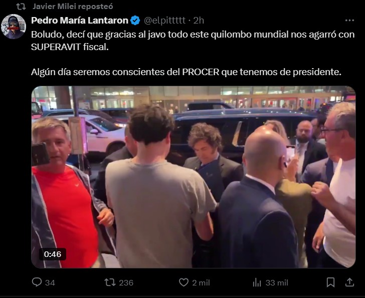 El presidente retuiteó un posteó de una cuenta que sostenía: “Decí que gracias al Javo todo este quilombo mundial nos agarró con SUPERAVIT fiscal”.